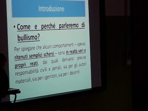A scuola, alcuni comportamenti dei giovani studenti spesso sono ritenuti semplici scherzi, sono in realtà veri e propri reati civili e penali, che possono avere amare e pesanti conseguenze penali sia per gli autori materiali del comportamento scorretto, sia per i loro genitori, sia per i loro docenti. Le violenze più comuni, che avvengono tra ragazzi, sono le offese, parolacce, insulti, la derisione, la diffamazione, l’esclusione dalla vita in comune del gruppo. Nel 4% dei casi si arriva anche a botte, calci e pugni. Sono stati analizzati anche i rischi e le responsabilità incombenti sui ragazzi e loro genitori per l’uso scorretto dei social. I ragazzi devono stare molto attenti anche quando in maniera superficiale mettono dei “like” su post diffamanti trovati sui social, quali Facebook o altri. Molta attenzione occorre fare anche nel commentare le “fake news”. È importante saperle riconoscere ed evitarle.