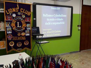 “Il Lions Club di Sulmona ha incontrato gli studenti del Liceo Linguistico-Socio-Pedagogico “Giambattista Vico”. Si è parlato di Bullismo e Cyberbullismo, con una professionale relazione dei giovani avvocati di Sulmona Michela Giannone e Alfieri Di Girolamo, si è chiarito quali siano i comportamenti per i quali si può parlare di bullismo e cyberbullismo. Due fenomeni in preoccupante crescita sia nel mondo maschile che nel mondo femminile. Tanto avviene perché sembra che i giovani adolescenti non sappiano fare ricorso all’empatia che è la transitoria identificazione con l’altro, per cui si soffre se l’altro soffre.